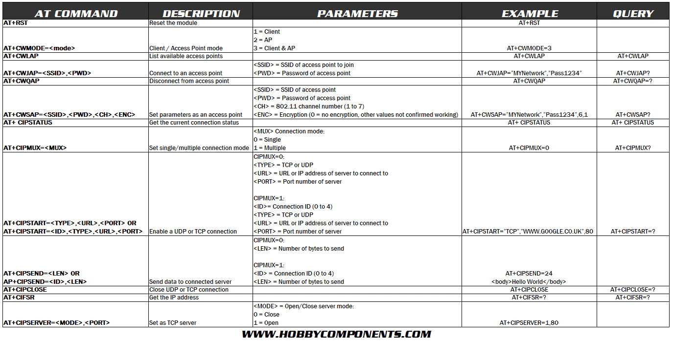 در زیر لیست دستورت این بورد جهت اتصال به دستگاه های وای فای دار مثل تلفن همراه و یا حتی مودم ADSL آورده شده.(توی یک صفحه دیگه از مرورگر بازش کنید خواناست)