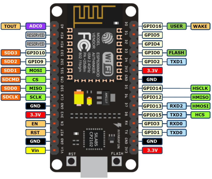 پایه VCC برای ولتاژ ورودی 3.3v استفاده میشه و GND همون پایه منفی برد هستش .دوتا پایه CH_PD و RESET بیشتر برای برنامه نویسی این برد و کامپایل کد بکار میاد اما این نکته رو هم بدونید که بیشتر وقت ها (تقریبا همیشه) پایه CH_PD هم باید به ولتاز مثبت ورودی برد وصل بشه.